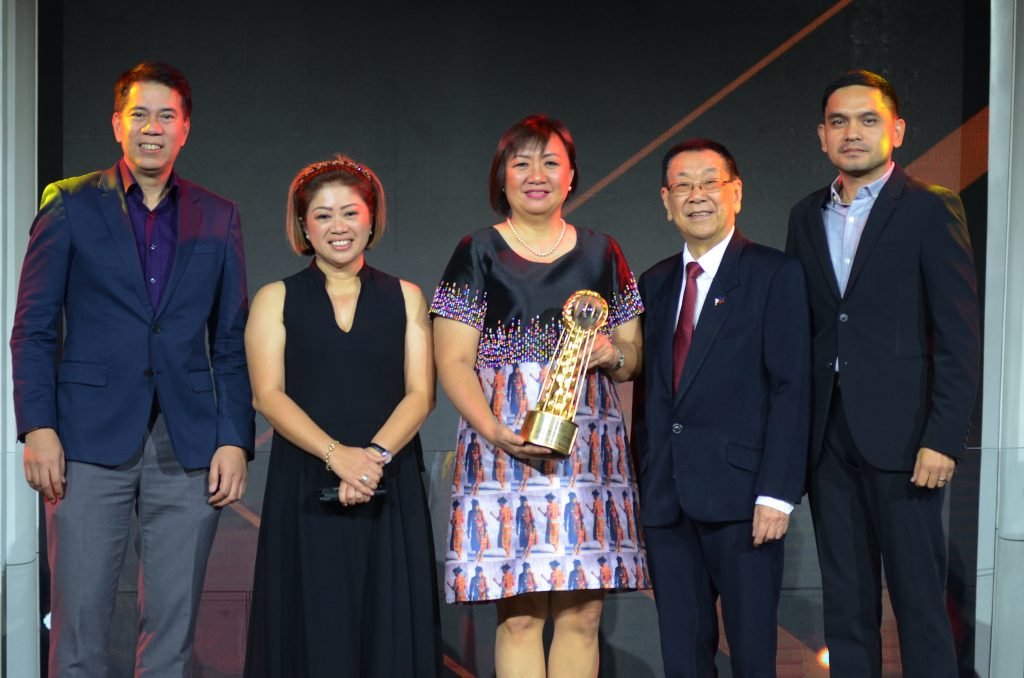 (Davao City Tourism Officer Ms. Generose Tecson, along with Sunrise Events Inc. General Manager Ms. Princess Galura, receives the award for Destination Marketing of the Year for their efforts in promoting Davao City as a safe place for sporting events, the year after the Marawi siege. They are joined onstage by DOT Undersecretary Benito Bengzon Jr., PSTA Founder Charles Lim, and Primetime CEO Pauland Dumlao.)